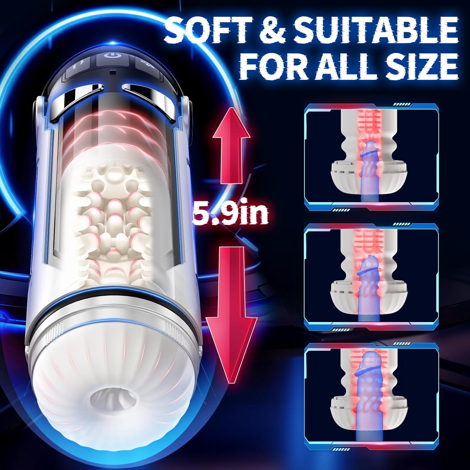 Automatic Male Masturbators Male Sex Toy with 4 Thrusting Modes Heating Male Masturbator【3D Soft Textured Sleeve & Fits Most Size】This sleeve of this male sex toys is made of a soft material that is odorless and safe for the body. The elastic material can accommodate most sizes without any circumference issues. Ergonomically designed penis pump interior of the sleeve is covered in plump particles that can provide an overwhelmingly realistic oral sex-like stimulation to the penis.