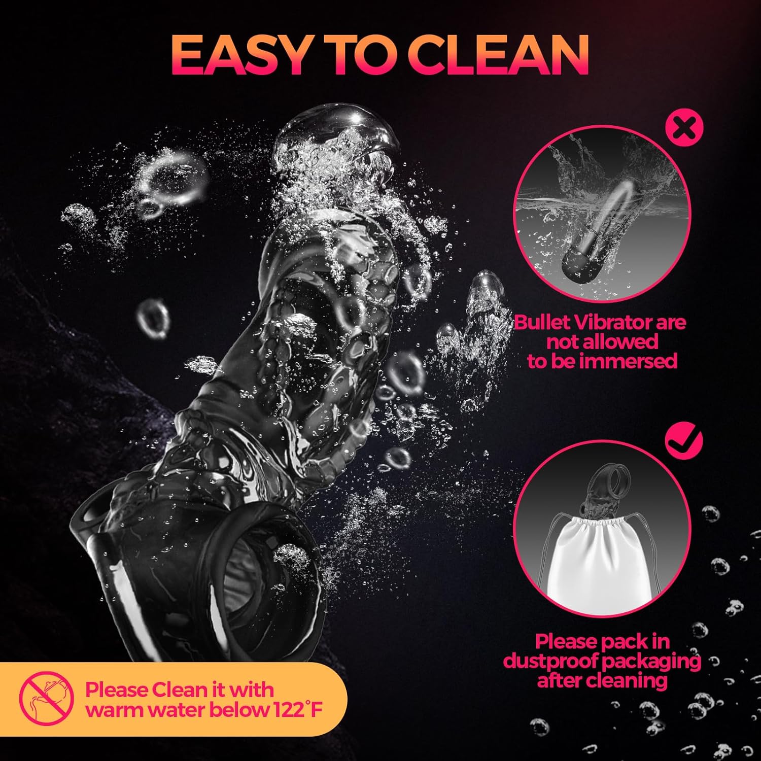 【Easy to Use & Clean】1. Fold the sleeve gently inside out, put the bullet vibrator into the capsule, please pay attention to the direction of the switch is outwards. 2. Pull the penis sleeve down until it fully cover the penis or toys, you can add some lube if you like. 3. InstalL the upper bullet vibrator and turn on the dual vibrators, add some lube to the top of the penis sleeve. 4. Please remove the bullet vibrator from the sleeve before starting to clean it. Penis sleeve can be cleaned directly with water, but do not allow water to enter the bullet vibrator. 5. Allow to dry in a ventilated place, store it in a clean and dry place, avoiding contact with other objects.